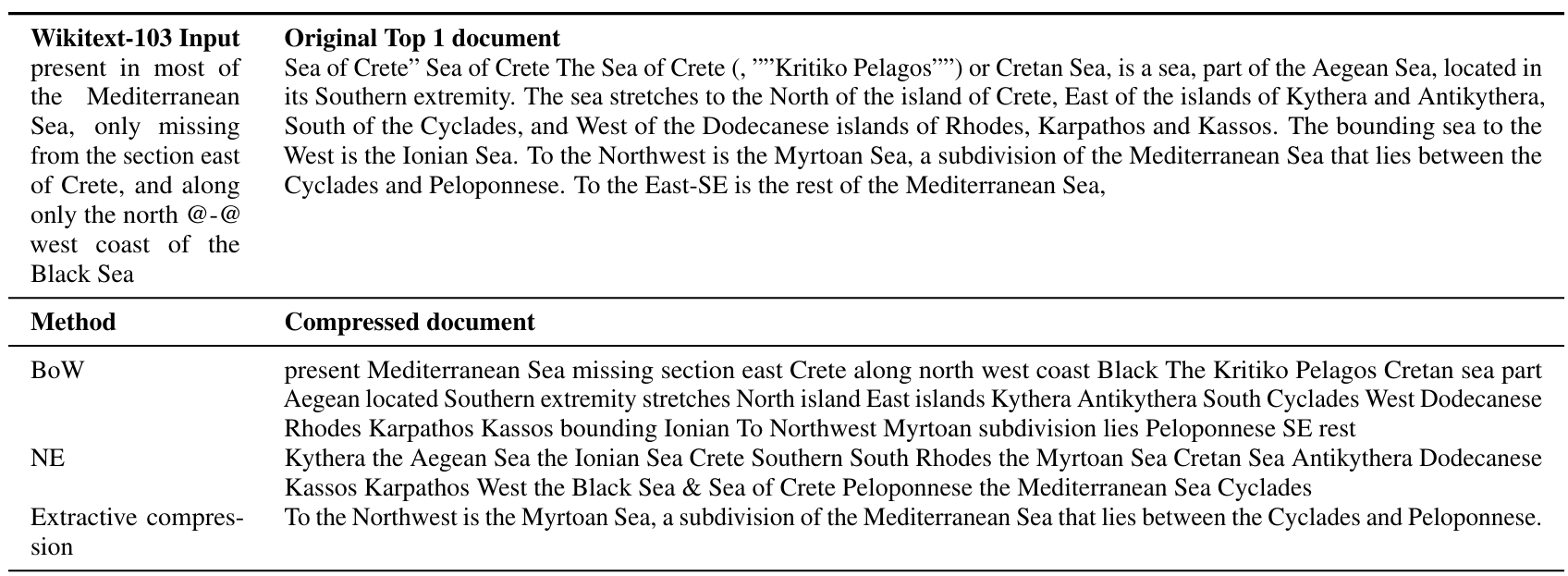 - Phrase/token level compression: 압축을 하긴 하는데, 기존 방법론으로 시도한다. Bag-of-Words 기법은 빈도관계 없이 uni-gram으로 만들어서 공백단위로 합쳤다고 한다. NE는 Named Entity 만 추출해서 ' '.join(NE_list) 처럼 합쳤다고 한다. 이거 밑에 그림 넣어뒀으니 보면 이해가 잘 될 것이다. 여튼 기존 압축 방법론으로 해봤다는 점. 토큰 수가 확실히 줄었다.