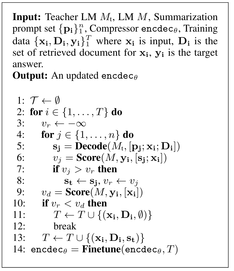- 5 ~ 8번 라인: 각 후보를 입력에 붙여서 언어모델의 점수를 측정한다. 가장 뛰어난 요약 후보가 함께 주어졌을 때 정답 생성 능력이 가장 좋을테니까. n개 중 최고 성능 점수를 기록한 요약을 저장하는 게 8번 라인이다.