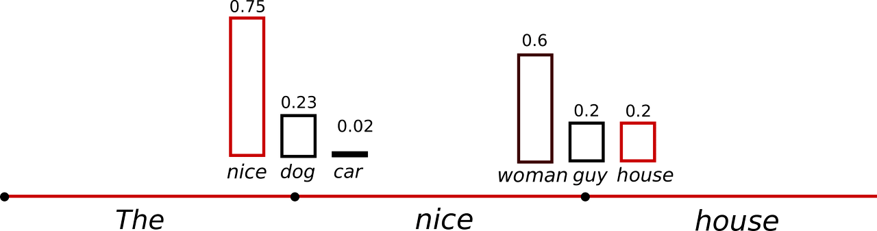 - 'The dog has' (0.4 * 0.9 = 0.36) > 'The nice woman' (0.5 * 0.4 = 0.2)
