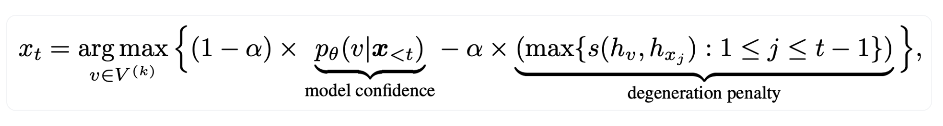 얼마나 기존에 생성했던 결과들과 구별되는가(discriminative)를 측정한다. 저기서 s 는 token representation 간의 cosine similarity 를 의미한다. 그리고 max 가 있으니, 그중에서도 제일 큰 값을 얻을 것이다. 즉, 기존에 생성했던 토큰과 유사한 토큰을 생성하려고 할수록 degeneration penalty 값은 크다.