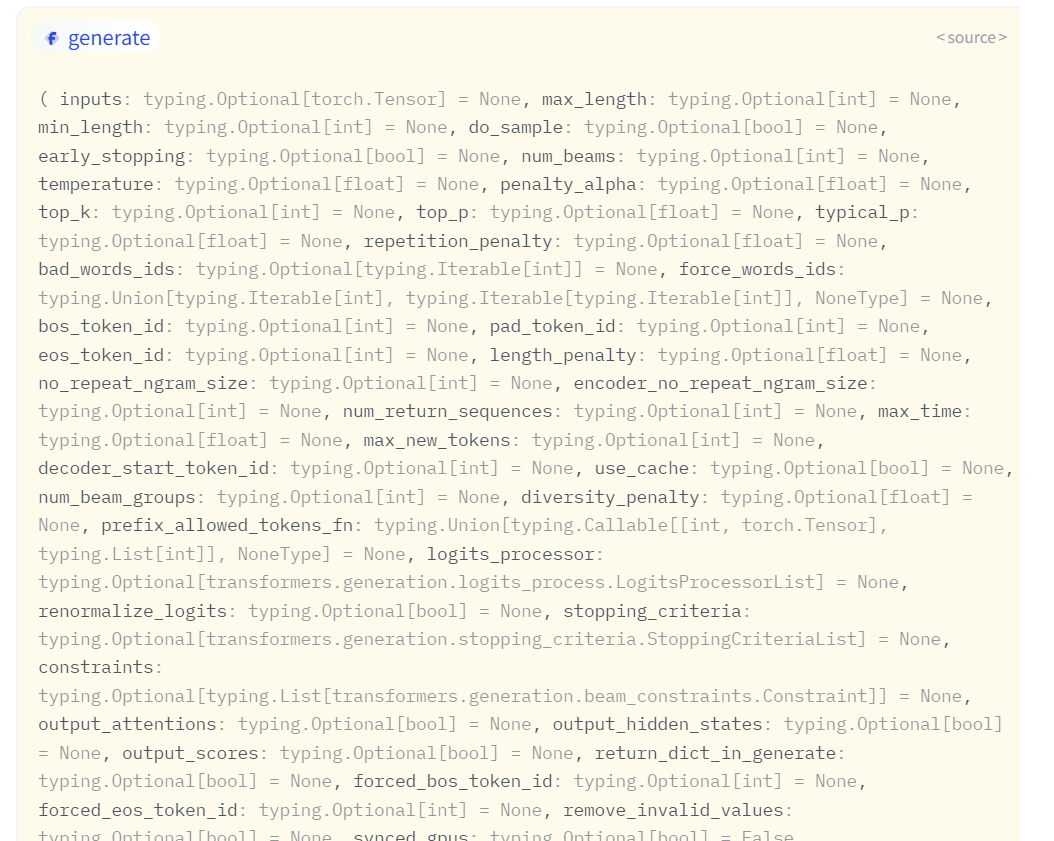하지만, 아래 그림처럼 generate 의 parameter 개수만 45개다. 이걸 언제 다 읽고 사용해보나 싶더라.