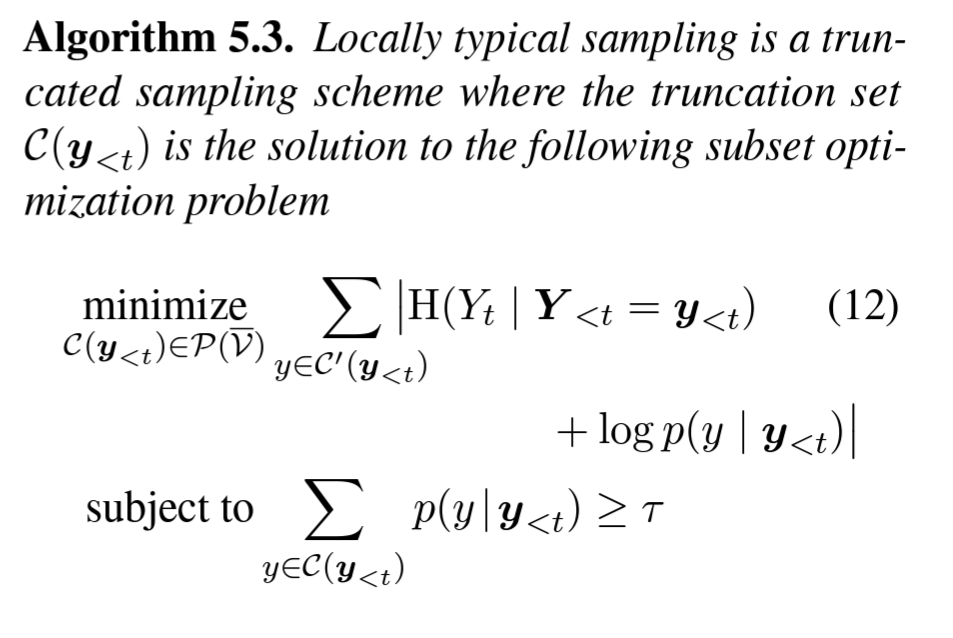 In words, Algorithm 5.3 limits the sampling distribution to only those words with negative logprobability within a certain absolute range from the conditional entropy (expected information content) of the model at that time step.