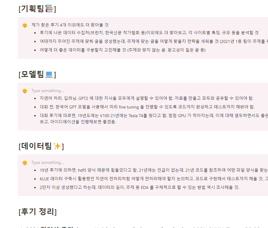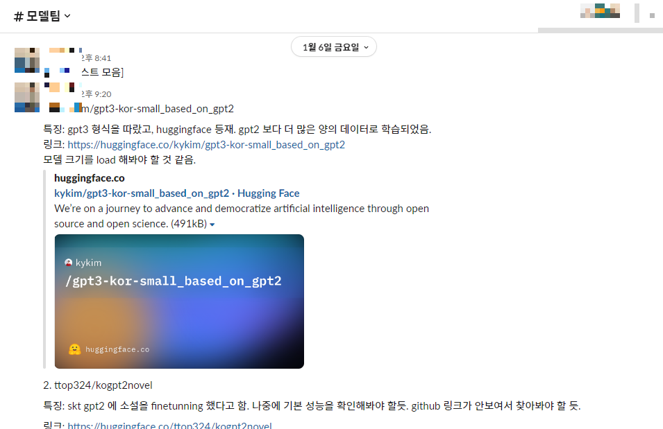 확실히 이분들의 도움이 없었다면, 방향성을 잡기가 어려웠다. AI 가 처음인 친구들에겐 특히 그 흐름을 익히는데 도움이 된 것 같다. 그리고 인공지능이 쓴 글들을 올려놓은 팀도 있으니 꼭 읽어보길 바란다.
