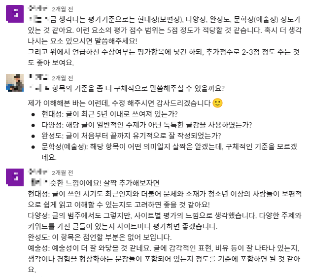 배울 점이 많았고 새해부터 이런 뜻깊은 경험을 할 수 있어서 감사하다. 솔직히 말하자면, 결과를 바로 수용하는 것은 어렵기도 했다. 무엇보다 우리 팀이 쏟았던 시간과 노력, 문학적인 전략과 AI 전략, 결과물, 발표 등 후회 없이 달려왔기 때문인 것 같다. 하지만 이 글을 쓰면서 내가 놓쳤던 부분들이 보였고, 겸손해졌다. 동시에 많은 것을 배웠다고 느낀다.