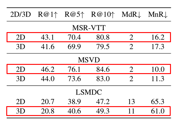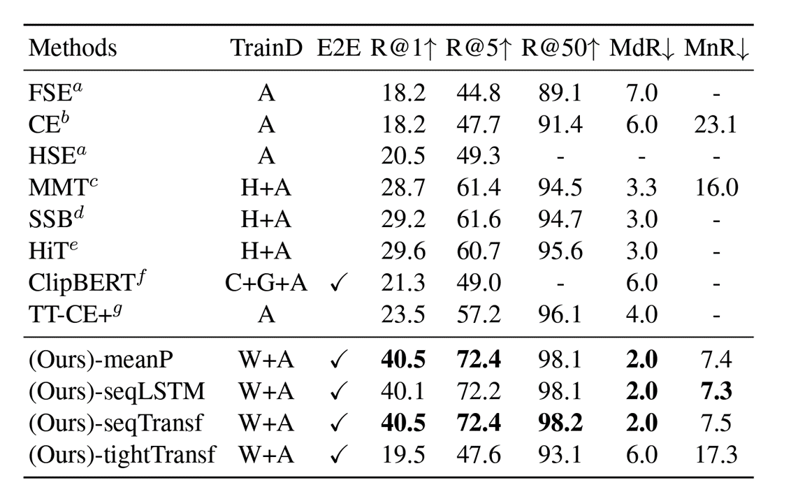 - tight type 이 대부분 가장 성능이 안 좋았다. 이 점으로 볼 때, 충분한 크기의 데이터셋이 없다면 text 와 video 사이의 cross-modality 를 배우는 건 아직 어렵다고 볼 수 있다.