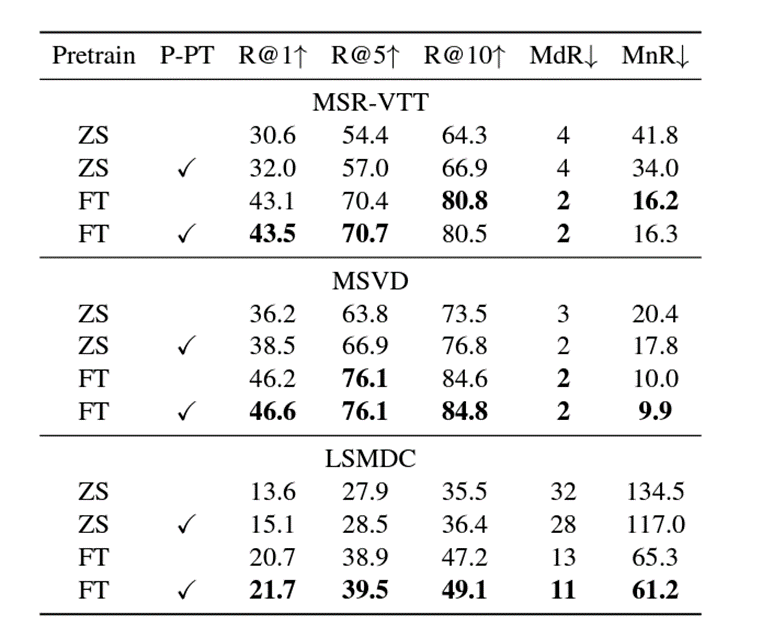 - L: LSMDC, H: HowTo100M, W: WIT, MD: MSR-VTT,LSMDC,HowTo100M, CW: CC3M + WebVid-2M