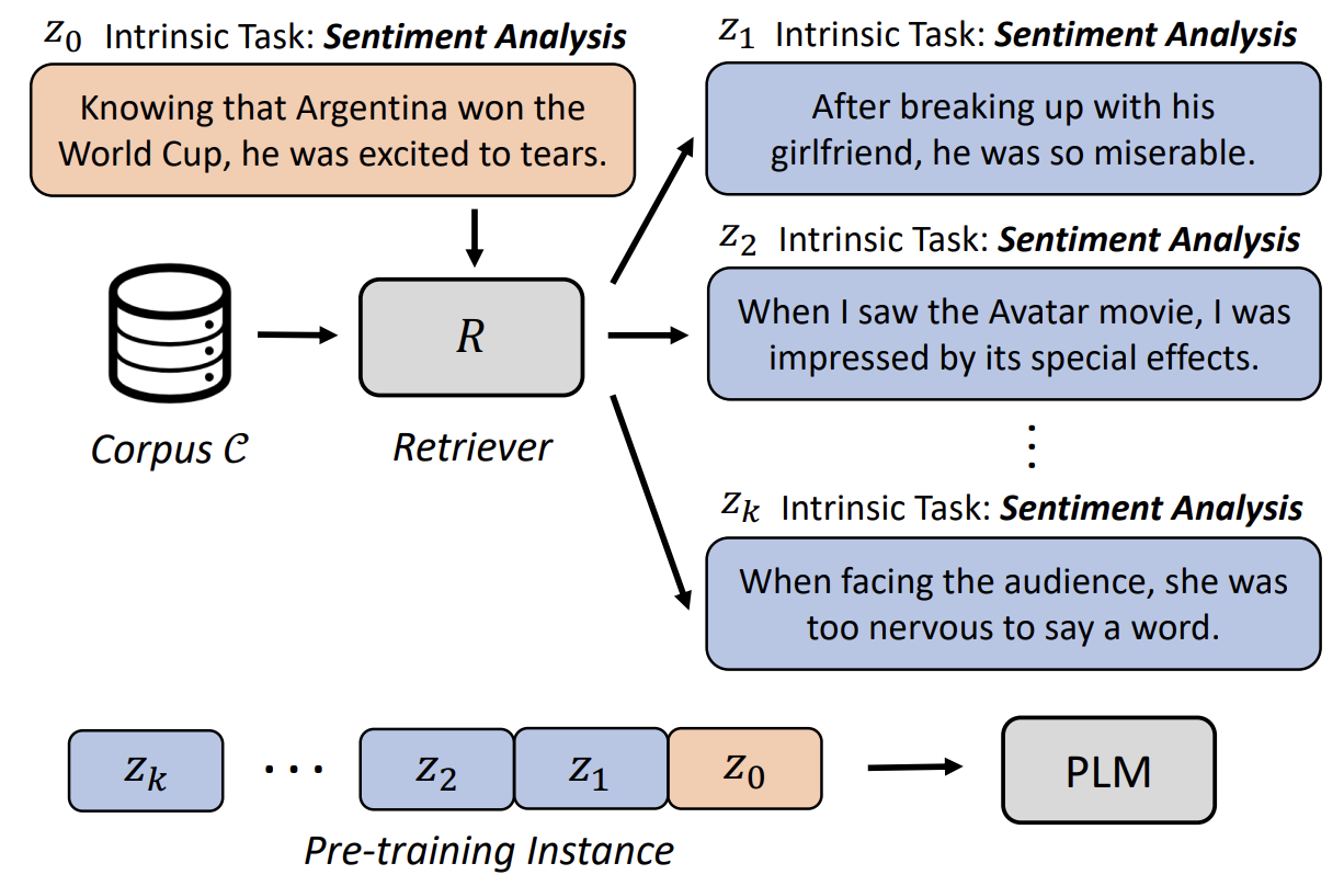 - 저자는 이렇게 가정한다: 사전학습에 쓰일 코퍼스는 각 문장마다 intrinsic task 가 있다. 즉, 사실은 내재된 task 가 있다고 본다. 이걸 retriever 를 통해 각 문장마다 어떤 task 가 내재되어 있는지 분류한다. 그래서 같은 task 에 쓰일 것 같은 문장들끼리 묶어서 학습하는 게 그냥 학습하는 것보다 좋다는 게 저자의 주장이다.