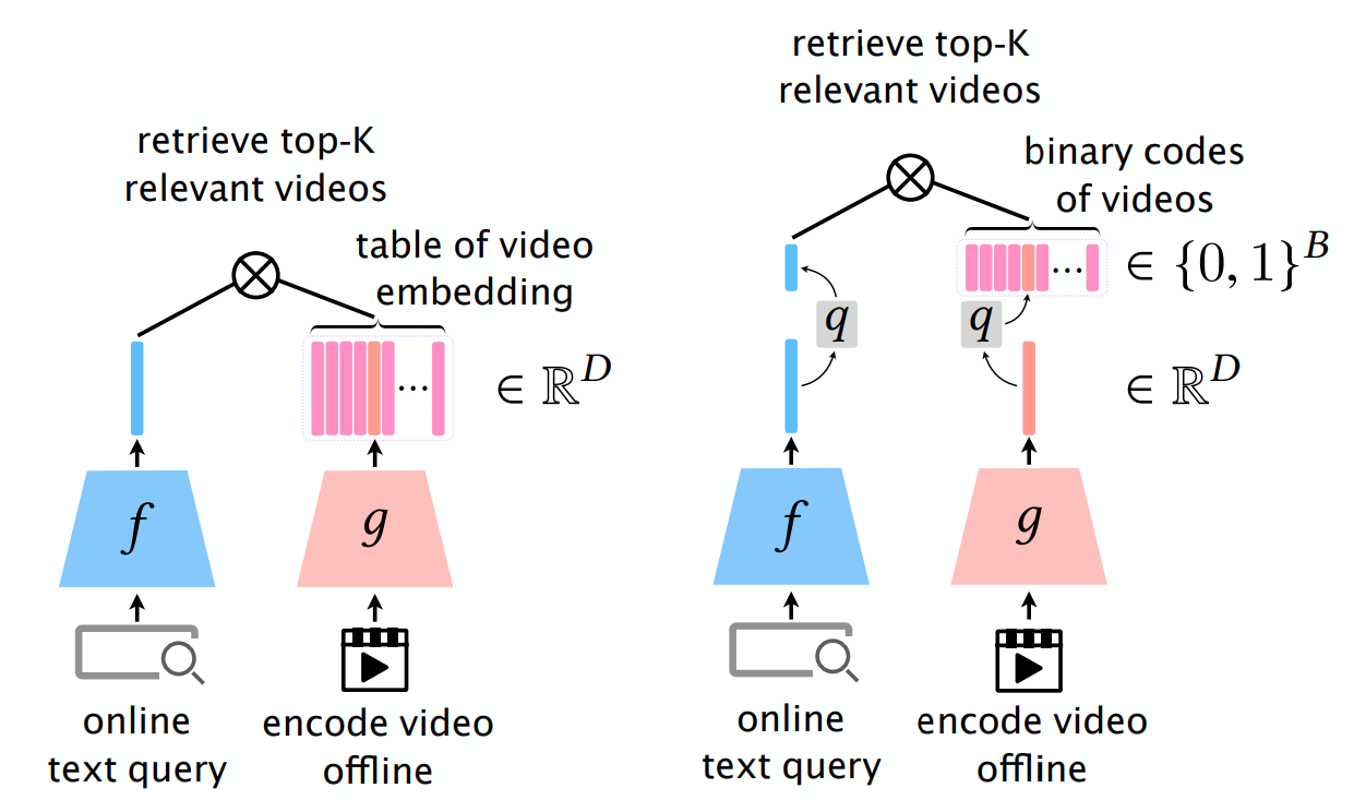 - 왼쪽의 문제는 실제 세상에서 사용할 때, 모든 비디오를 임베딩하는 과정이 비싸고 저장하는 비용도 만만치 않다는 것이다. 그 이유는 실수 형태의 큰 차원 벡터로 저장되기 때문이다.