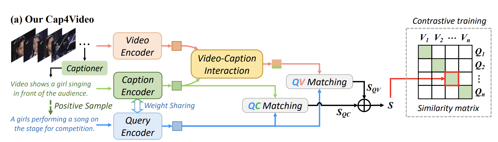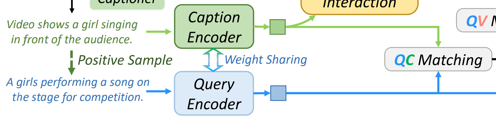 - video, query, caption 모두 encoder 를 통해서 각각 임베딩