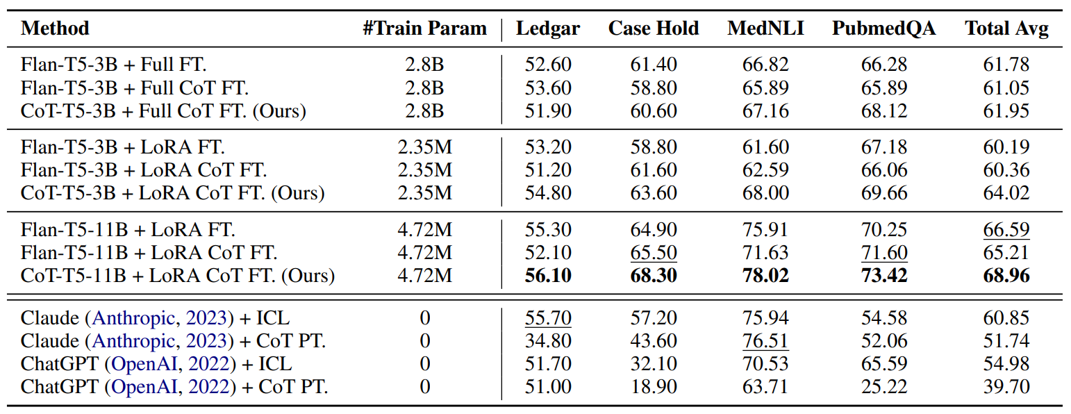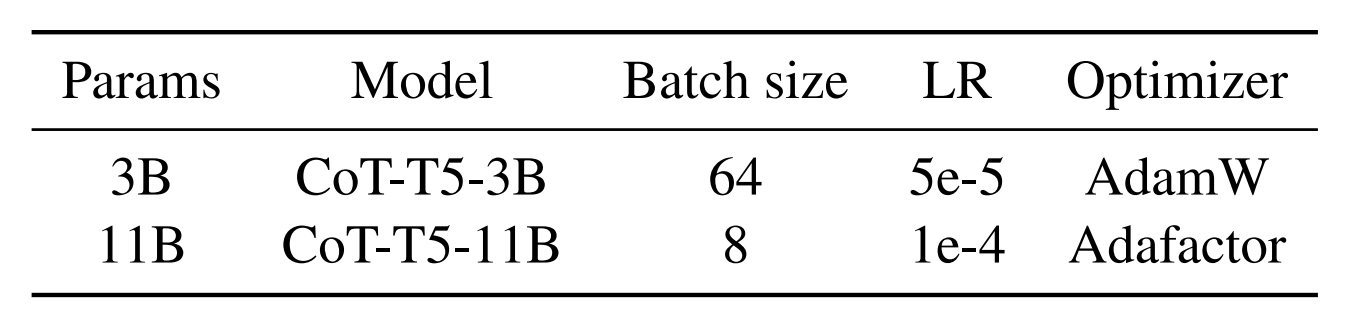- T5-3B + CoT FT: 우리 모델과 다른 점은 우리는 FLAN-T5 를 베이스라인 모델로 삼은 거고, 이건 진짜 기초 T5에 본 논문에서 제작한 CoT dataset 을 fine-tuning 한 것이다