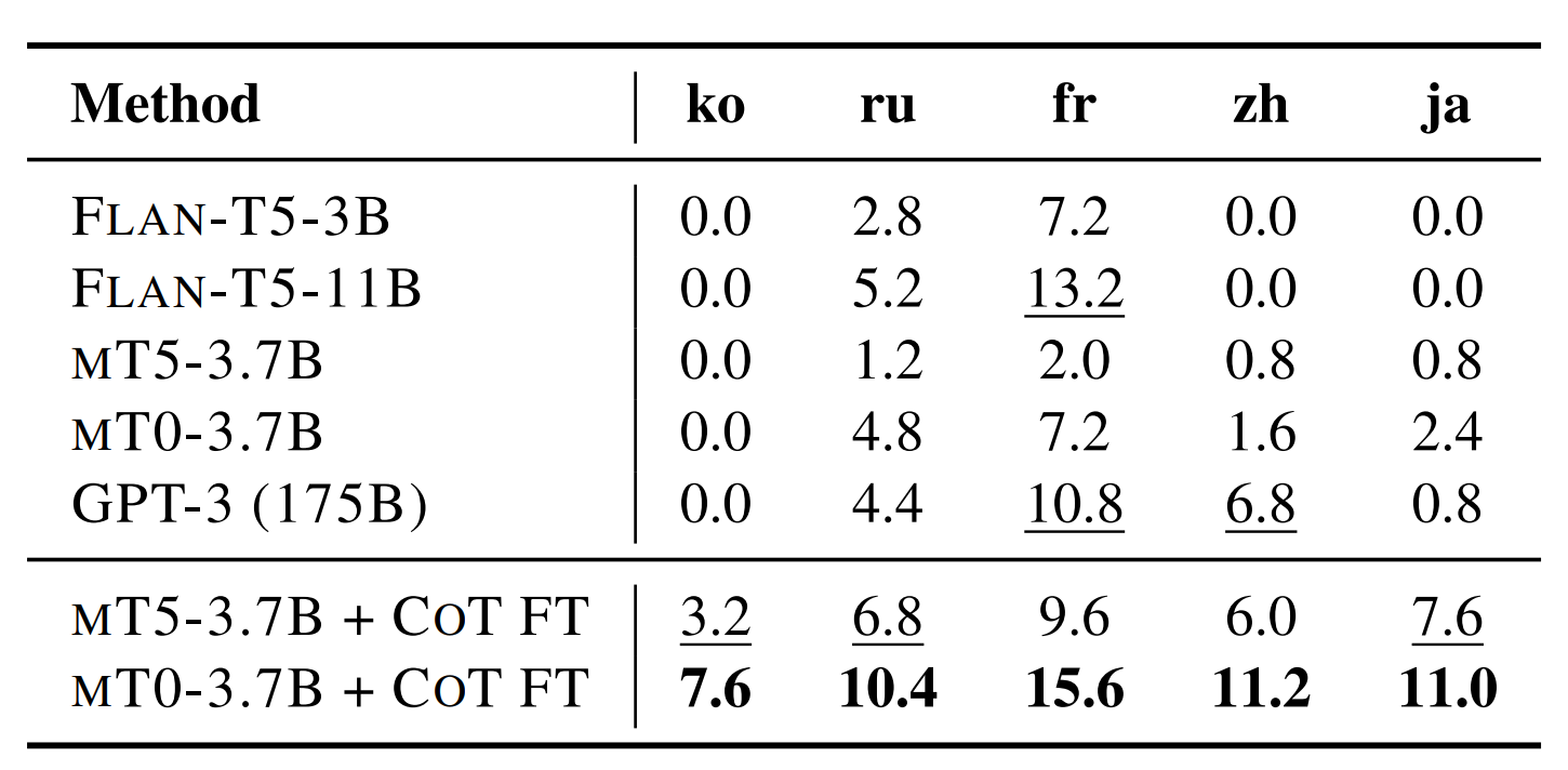 - mT5 + CoT FT: CoT collection 을 ChatGPT 로 언어별로 60K ~ 80K개 번역해서 학습한 모델