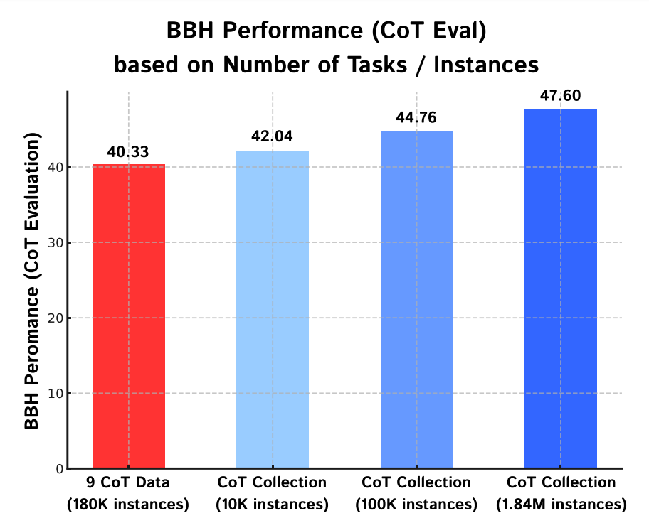 - 하지만 CoT fine-tuning 을 적용했던 한 연구는 소수의 task(9개)에 대해서만 데이터셋을 제작하였기 때문에, 나머지 태스크 1827개에 대해선 일반화 성능이 저조했음