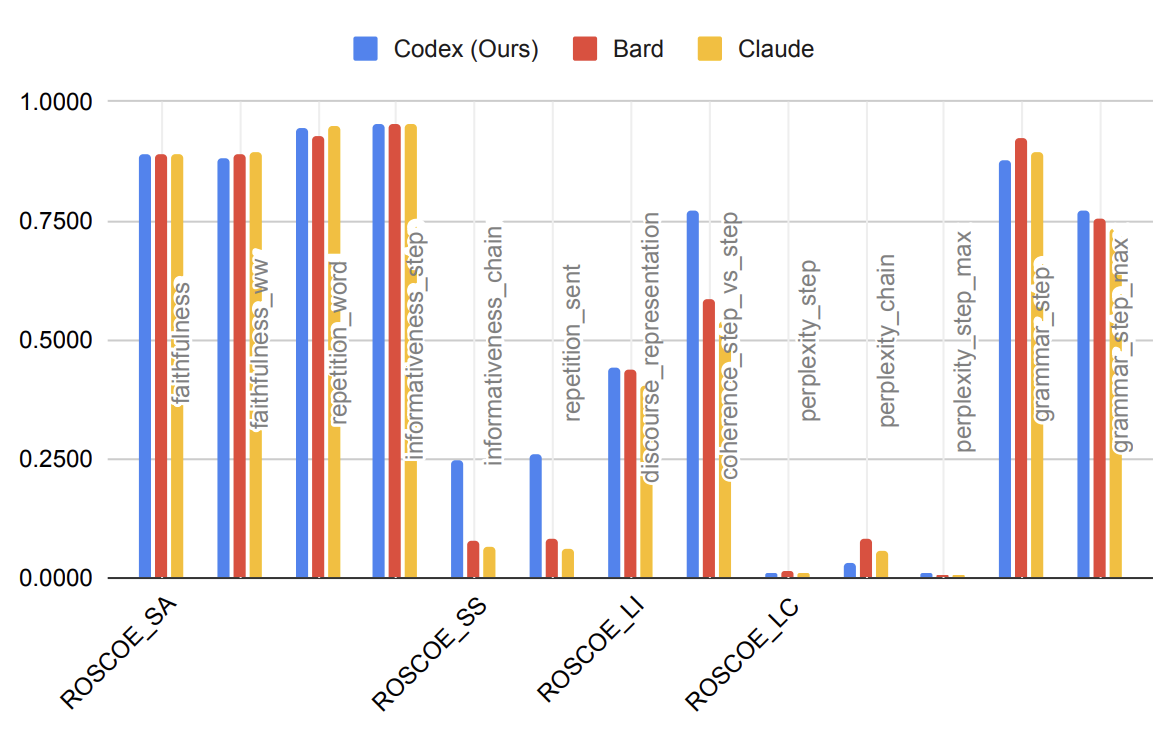 - ROSCOE: 처음 보는 지표인데 논문 제목이 "Suite of Metrics for Scoring Step-by-Step Reasoning" 인 걸 보니까 이런 데이터셋을 평가하는데 도움이 되는 것 같다. 여기 적힌 모든 지표가 ROSCOE에서 평가한 수치라고 한다.