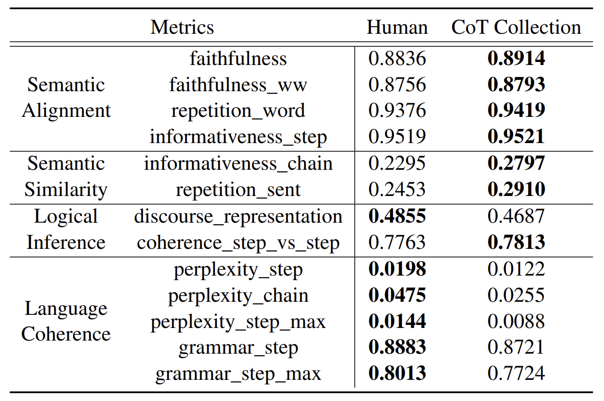 - CoT Collection 은 본 논문에서 거대모델로 만든 것이고, Human 은 아까 예제를 위해 저자 3명이서 만들었던 예제라고 한다.