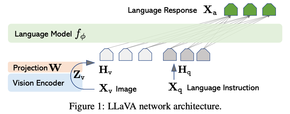 - 이미지: 이미지는 이미지 인코더 거치고, projection layer W를 통해 차원만 맞춰서 언어모델에 넣어준다