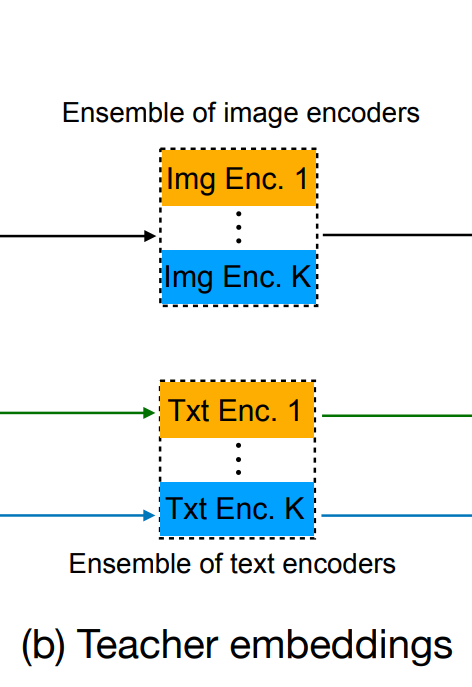- a strong ensemble of pretrained CLIP models: '일단 잘해라. 그러면 누가 경량화해줄 것이다.' 내가 지어낸 말이다. 하지만 딥러닝의 규칙과 같다. 일단 무겁더라도, 돈이 많이 들더라도 뛰어난 성능을 보인다면 그걸 효율적인 구조에 담아내는 건 비교적 쉽다. 그래서 어느 정도 정복된 text-to-image Retrieval 분야를 mobile device 로 옮기려는 시도에 이런 방법은 필수적인 것 같다.