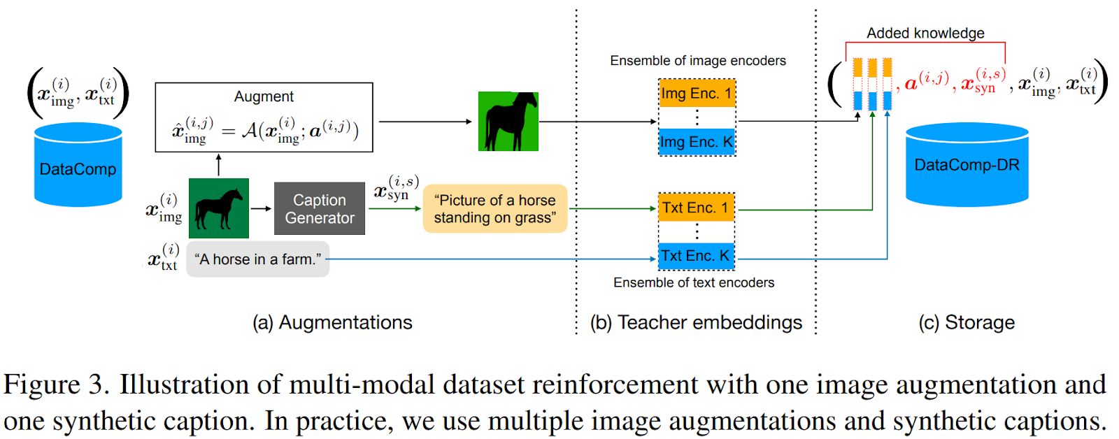 - 증강한 이미지와 자막, 그리고 teacher model embedding 을 기존 데이터셋에 더해 저장한다.
